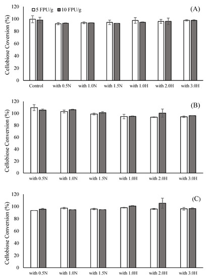 Cellobiose and Avicel were hydrolyzed with and without lignin isolates to determine whether enzyme binding onto lignin isolate impacted their conversion to glucose. Cellobiose hydrolysis with CTec2 (5 and 10 FPU/g cellobiose) showed that approximately 99% of cellobiose was converted into glucose regardless of CTec2 dose. However, 29.3 and 47.7% of Avicel was converted into glucose at 5 and 10 FPU/g Avicel of CTec2 loading, respectively. Avicel is crystalline cellulose, and the interlinking of the cellulose microfibrils via hydrogen bonds may limit hydrolysis [52]. BG, CBH, and EG are needed for Avicel conversion to glucose, and the results suggested that higher levels of CBH and EG might be needed to further improve glucose production from Avicel.