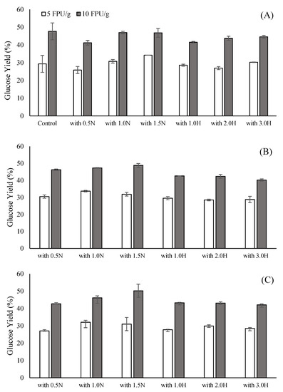 To decrease lignin-induced inhibition, a pretreatment step is typically necessary to allow enzymes to access structural carbohydrates with greater enzyme saccharification efficiencies [21,22]. Dilute sulfuric acid (H2SO4) pretreatment has a significant effect on sugar production through solubilization of hemicellulose and redistribution of lignin, thus increasing cellulolytic enzyme accessibility [23,24,25]. Alkali pretreatments, such as those with sodium hydroxide, facilitate improvements in sugar production by solubilizing and extracting lignin (or certain monomers, of lignin such as G and H units) and increasing the surface area available for enzyme attachment [26,27].