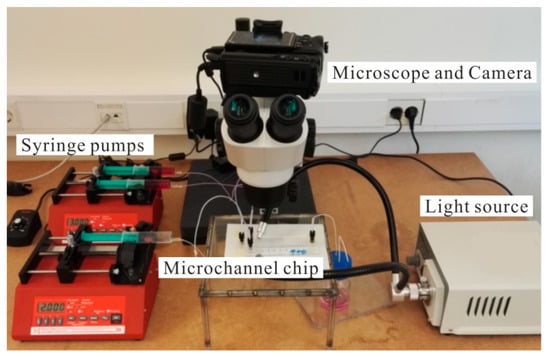 In this experiment, syringe pumps were used to control the injection flow rate, which was kept constant, similar to the common situations. The slugs inside the microchannel were observed by a microscope, and the images were captured by a digital camera. A laser light source was employed to provide sufficient lightness for the image shoot. Finally, a bottle was connected to the outlet of the microchannel to collect waste liquids.