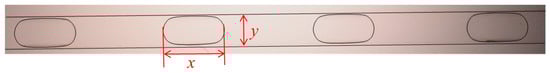 In the experiments, the constant injection flow rates both for the continuous and dispersed phase were set as 0.001 m/s, 0.002 m/s, 0.003 m/s and 0.004 m/s, respectively. The images captured by the digital camera were used to measure the slug size and separation distance. According to the characteristics of similar figures, the ratio between the channel width (600 μm) and the real slug size equals the ratio between the values measured from the pictures. As shown in Figure 3, x represents the measured slug maximum length, and y represents the measured channel width.