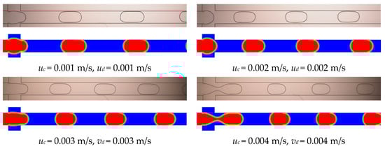 Numerical simulations for the operating conditions of constant injection flow rates were conducted. The injection flow rates corresponded to the experiments. The flow patterns obtained from the numerical simulations were compared with the experiments. As shown in Figure 4, the simulated flow patterns agree well with the experiments. In Figure 4, the symbols uc and ud represent the continuous and disperse phase flow rate, respectively.