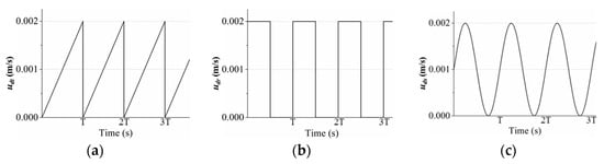 Dynamic dispersed injection flow rate of different types. (a) Triangle wave dynamic injection flow rate (udt); (b) Rectangular wave dynamic injection flow rate (udr); (c) Sine wave dynamic injection flow rate (uds).