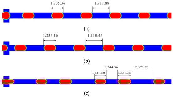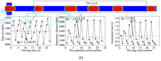Slug generation obtained from numerical simulations for a triangle wave dynamic dispersed injection flow rate. (a) The slug generation for the condition of a triangle wave dynamic dispersed injection flow rate with a cycle of 2 t0; (b) The slug generation for the condition of a triangle wave dynamic dispersed injection flow rate with a cycle of 3 t0; (c) The slug generation for the condition of a triangle wave dynamic dispersed injection flow rate with a cycle of 4 t0.