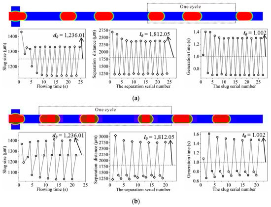 With different cycles of the dynamic dispersed phase injection flow rate, the flow pattern, the slug size, the separation distance and the slug generation time, are analyzed. Figure 8 reveals that the slug generation changes periodically, when the cycles are 2 t0, 3 t0 and 4 t0. The slug size, the separation distance and the slug generation time oscillate near the values obtained under the condition of a constant injection flow rate. When the cycle of the dynamic dispersed phase injection flow rate is 2 t0, there are two points in one slug generation cycle. When the cycle of the dynamic dispersed phase injection flow rate is 3 t0, there are three points in one slug generation cycle. Similarly, when the cycle of the dynamic dispersed phase injection flow rate is 4t0, there are four points in one slug generation cycle. Under the conditions of a dynamic dispersed phase injection flow rate with the three cycles investigated in this section, the slug generation is periodical, and the number of slugs generated in one generation cycle is related to the flow rate cycle. As mentioned in Section 4.1, the critical pressure drop, resulting from the combination of the continuous and dispersed phases, causes the slug generation. The number of points in one cycle of the slug generation reflects how many times the critical pressure drop is achieved.
