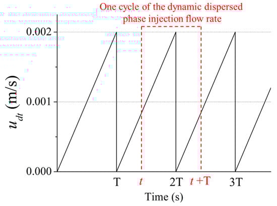 In this section, the slug generation with a constant injection flow rate is numerically simulated at first. Then, the slug generation with a dynamic dispersed phase injection flow rate is analyzed. The dispersed phase dynamic injection flow rate follows three common wave types, namely, a triangle wave dynamic injection flow rate udt, a rectangular wave dynamic injection flow rate udr and a sine wave dynamic injection flow rate uds, as depicted in Figure 5. The effects of the dynamic dispersed phase injection flow rate for different types and different cycles on the slug generation are also discussed.