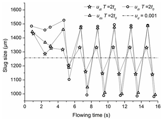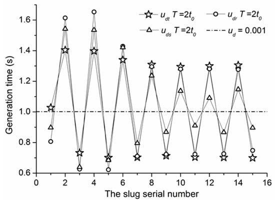 The times spent in generating each of the slugs are depicted in Figure 7, to further investigate the effects of the dynamic dispersed phase injection flow rate on the slug generation. When the cycles of the dynamic dispersed phase injection flow rate are 0.5 t0 and t0, the slug generation time is equal to t0, after the flow has become stable. However, the slug generation time changes periodically, when the cycle of the dynamic dispersed phase injection flow rate is 2 t0.