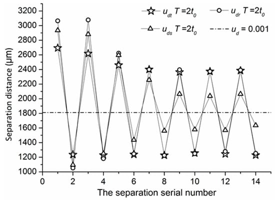 The separation distances for dynamic dispersed phase injection flow rates of different type are shown in Figure 11. For the three types of the dynamic dispersed injection flow rate, the separation distance changes periodically, and it oscillates near 1,812.05 μm, which is the separation distance of the constant injection flow rate. Concerning the amplitude of the separation distance, the sine wave dynamic dispersed phase injection flow rate has the minimum amplitude, which is about 230 μm, while the amplitude of the separation distance for the triangle wave dynamic dispersed phase injection flow rate is the maximum, which is about 569 μm.