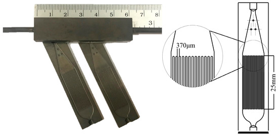 The lab-designed micro-structured stainless steel (316L) plates were commercially made (TGI, Chonburi, Thailand), as shown in Figure 1. Each substrate has 14 channels with 300 µm depth, 370 µm width and 25 mm length per channel. The plates were cleaned by etching with 20% citric acid in an ultrasonic bath for 30 min. They were subsequently annealed at 800 °C for 2 h in air to form a layer of mixed metal oxides for better adhesion strength.