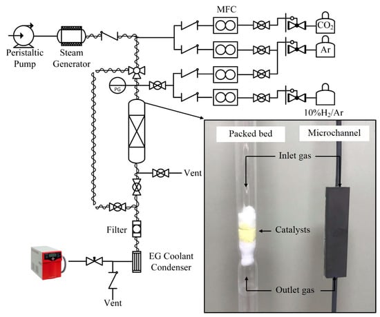 The catalysts were pelletized and sieved to 180–212 µm for the packed-bed reactor, and <38 µm for the micro-channel reactor. The weight of the catalyst was 1 g and 8–15 mg for the packed-bed reactor and the micro-channel reactor, respectively. Each catalyst was placed inside the quartz tube packed-bed reactor (i.d. = 10 mm, length = 50 cm) between two layers of quartz wool. The packed-bed and micro-channel reactors were placed in the middle of an electrical furnace (Inconel, 20 cm heating zone). The schematic diagram of the experiments is shown in Figure 2. The system was purged by 300 mL/min of Ar using a mass flow controller (New Flow-TLFC-00-A-1-W-2, 10–500 mL/min) at room temperature for 1 h. Each catalyst was reduced before use in 10% H2/Ar at 700 and 900 °C, in accordance with the TPR results, for 30 min. Steam was generated using a steam generator, whereby the amount of water was controlled by peristaltic pump (BT100M Model, 0.00067–65 mL/min). Steam was delivered to the reactor system through a 170 °C trace-heated line to prevent condensation. The total flow rate of 200 mL/min, which ensured the reaction control regime, was fixed for all of the experiments. The reaction was isothermally operated at 700 and 900 °C. The gaseous product stream was analyzed using an on-line mass spectrometer (Quadrupole, Omnistar, GSD 320 O1 Model).