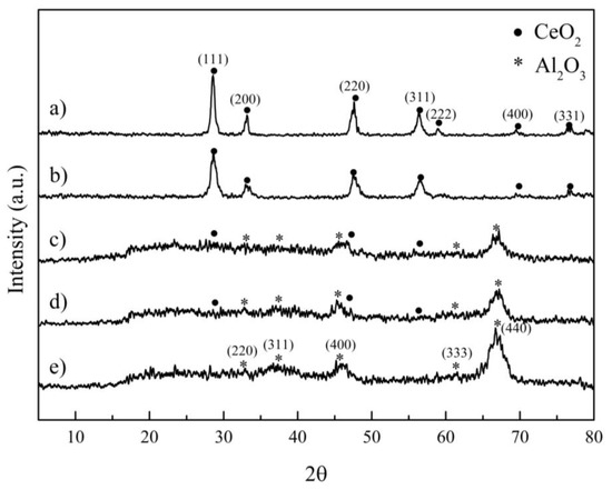 XRD patterns of (a) CeO2, (b) Ce0.75Zr0.25O2, (c) 10% CeO2/Al2O3, (d) 10% Ce0.75Zr0.25O2/Al2O3, and (e) pure alumina.