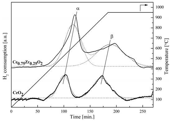 TPR profiles of CeO2 and Ce0.75Zr0.25O2 for temperatures ranging from 30 to 950 °C, at heating rate of 5 °C/min, using 10% H2/Ar.