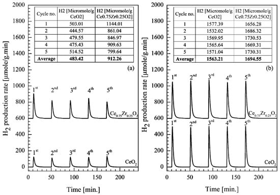 Catalytic performances of CeO2 and Ce0.75Zr0.25O2 towards the water splitting were tested in a packed bed reactor. The oxidation and reduction temperatures were paired at the same temperature to avoid temperature switching, aiming to maximize the overall process efficiency and minimize the thermal stress of the reactor. The selected temperatures of reduction and oxidation (Tred/Tox) were 700/700 and 900/900 °C.