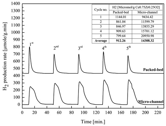 Ce0.75Zr0.25O2 was selected for this experiment. H2 production via both packed-bed and micro-channel reactors were compared. Uncoated micro-channel reactor was also introduced to the reactant stream and performed as a blank test. H2 productivity in all experiments was calculated per weight of catalyst used. H2 productivity from the blank micro-channel reactor, uncoated reactor, was subtracted from the catalyst-coated micro-channel reactor. The blank test was performed only for the micro-channel reactor, because the formation of metal oxides on the substrate surface after annealing, such as on Cr2O3, Mn2O3 and Fe2O3, could possibly be involved in the catalytic reaction. From Figure 7, the 5-cycle average amount of H2 production using the packed-bed reactor and the micro-channel reactor was 912.26 and 14,308.32 μmol/g. Thus, micro-channel reactor showed roughly 16 times better performance than the packed-bed reactor, in terms of H2 production. This was suggested to be the effect of its high surface-to-volume ratio, leading to an intrinsic reaction occurring at the molecular level [48,49,50,51]. It can be noticed that the H2 productivity of the packed-bed reactor decreased while that of the micro-channel reactor increased when the number of cycles increased. The decrease in H2 productivity in the packed-bed reactor was presumably due to the catalyst’s coagulation when repetitively used at such temperatures. On the other hand, the increase in H2 productivity in the micro-channel reactor was possibly the result of the reactive oxides, in which they were formed by the reaction of metals in the stainless steel and the oxygen in the system. Thus, the more cycles the reaction was run, the more H2 productivity was achieved. However, these H2 productivities in both type of reactor were supposed to be constant after a certain number of cycles.
