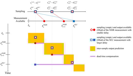Figure 1 depicts the two-step estimation process from time . We will use the workflow after the n-th sample is taken, to demonstrate how the multi-rate multi-delay observer works. As a first step, when the delayed H NMR measurement (which gives ) for the n-th sample becomes available at , the dead time compensation is triggered. Past estimation is generated by integrating the observer and compensator equations for the time range [, ]. In this compensator, the new value for is used as a delay-free measurement to reset the corresponding compensator . The compensator consequently updates the estimation for all states at , the ending time of compensation. This step makes use of the available measurements in the delay-free observer, in the same order as they are sampled. As a second step, the updated estimates are used as the initial condition for the observer coupled with inter-sample output predictors (7) at . In addition, this multi-rate multi-delay observer now works like a delay-free multi-rate observer with no delayed measurement, until the next measurement from SEC becomes available at .