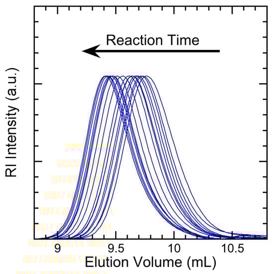 Figure 2 shows the SEC profiles for large-scale reaction of PMMA (PMMA-1) as a function of time. Data only after 240 min is shown as aliquots at earlier times did not precipitate due to low monomer conversion. Molecular weights and dispersity data were calculated from the SEC data for all aliquots (all time points) and are listed in Appendix A (Table A1) for PMMA-1 and the other large-scale polymerization reaction (PMMA-2: Table A2). The SEC profiles clearly shift to earlier elution volumes at later reaction times, indicating the growth of polymer chains throughout the reaction. Molecular weight increases from an M of 6,324 Da at 240 min to an M of 21,121 Da at 8,580 min. Dispersity is well controlled throughout the reaction as shown by the minimal change in the breadth of the profiles and dispersities less than 1.3 for all profiles except for the profiles at reaction times of 240 min and 300 min. High dispersities at low monomer conversions (i.e., early reaction times) are expected in RAFT polymerization reactions. Chromatogram profiles form a tail at high elution volumes at later reaction times signifying the formation of dead polymer chains due to termination reactions.