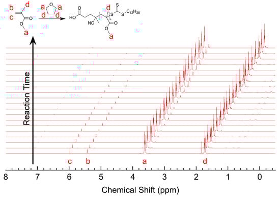 Figure A2 shows the corresponding H NMR spectra for all aliquots for the large-scale PMMA reaction (PMMA-2). Analysis of these spectra provide monomer conversion data, which is listed for each time point in Table A2. Four primary bands are visible (a, b, c and d) in each spectrum and were subsequently integrated. Monomer conversion was calculated from comparing the integral of band b at specified time to the integral of band b at t = 0, where the integral of band a was set as the reference. Monomer conversion ranges from 0% at 0 min to 90% at 8520 min.