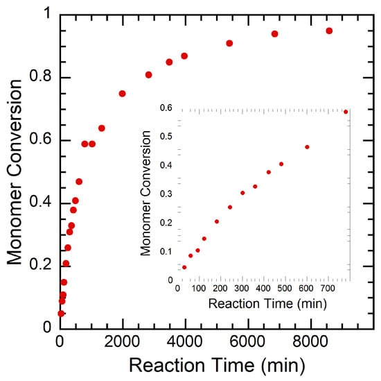 Polymerization kinetics (monomer conversion) of PMMA-2 as determined by H NMR. The inset window highlights magnified early reaction time results.