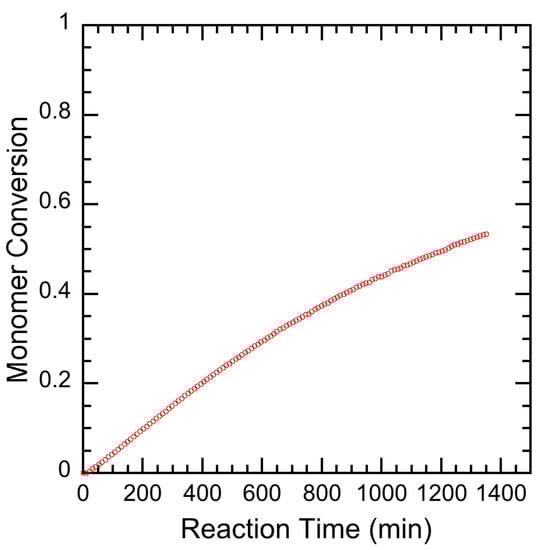 RAFT polymerization was first modeled by Zhang and Ray []. They modeled RAFT polymerization of methyl methacrylate in batch, semi-batch, and continuous stirred tank reactors, providing insight into how the mechanism of RAFT polymerization behaved throughout a typical reaction. Many more models have been developed to further explore the fundamentals of RAFT polymerization as more experimental data has become available [,,,,,,,]. Few of these models are validated against experimental data at higher monomer conversions, and those that are have few experimental data points above 60% monomer conversion. Additionally, the RAFT agent kinetic rate constants found in these models as fitting parameters are expected to be different for each monomer and RAFT agent pair.