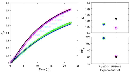 Experimental data obtained from small-scale reactions versus optimal fitting results. (Green circles are the data collected from PMMA-3 set and magenta ones are from PMMA-4 set. The solid symbols represent the Đ and estimated from the model.)