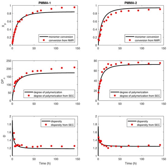 Figure 6 shows the experimental data obtained from the small-scale in situ H NMR experiments, as well as the obtained fits which give the best estimation of the fitting parameters using least squares. It can be observed that the fitting model shows excellent agreement with the measurement. As for the single sampled Đ and points on the right two plots, the estimated values from the model also match the experimental data well, especially for the PMMA-3 set.