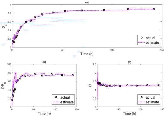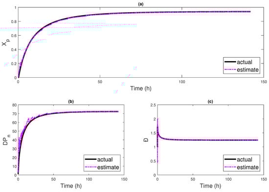 As these measurements are sampled with delay, no timely information is available in between measurements. Using observers to monitor the polymerization allows for an estimation of the missing information between each measurement, and thus provides an accurate estimation near the end point of the reaction to guide the operation of processes. Therefore, in this case, instead of the unmeasured states , the accurate estimation for is expected from the observer through: