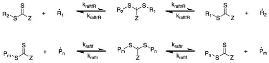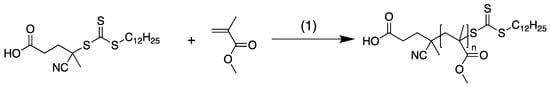 Reversible addition–fragmentation chain–transfer (RAFT) polymerization is a living polymerization that is based on free-radical polymerization []. Free-radical polymerization reactions are made living by the addition of a RAFT agent, which controls the polymerization via chain equilibration, in which radicals are shared between growing polymer chains. Since RAFT polymerization was first reported by Krstina et al. [], it has been further investigated by many researchers to show that it works with a wide variety of monomers and RAFT agents [,,,,,,,]. RAFT polymerization has been used to create polymers in many fields, including drug delivery [], electrochemical applications such as fuel cells [] and batteries [], and surface modification [], showing its versatility and applicability.