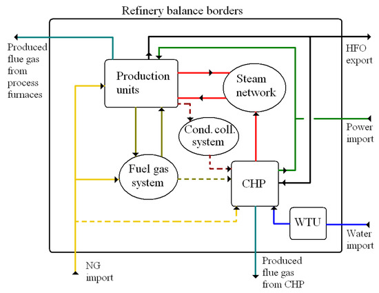 The general refinery structure and material and the energy flows of the analyzed problem are depicted in Figure 1.