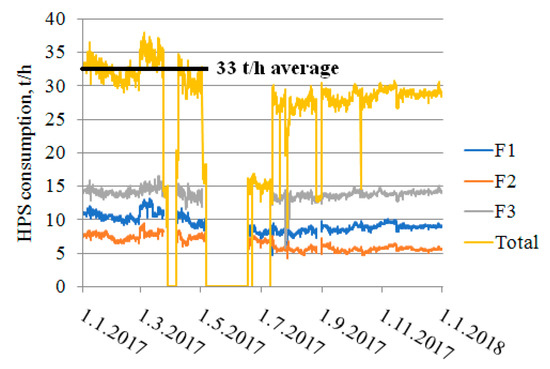 Furnaces F1 to F3 are positioned next to each other, using the same combustion air and flue gas system, and are fed by the same fuel gas. Combustion air preheated to above 100 °C is employed as a commonly used measure for decreasing the fuel consumption and increasing the furnace efficiency in the industrial sphere [49]. As seen in Table 1 and Table 2, temperatures in reboilers allow for switching to high pressure (3.5 MPa (abs)) as the process heat source.