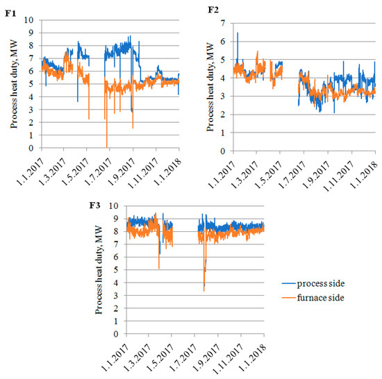 The furnace-side furnace duty of the k-th furnace is estimated by Equation (8), assuming that the fuel mass flow and composition are known and sufficient measured process data exist to calculate the mass and heat balance of its combustion. Thereby, the enthalpy flows associated with the combustion inlet air, , and with the released flue gas, , can be calculated. Heat loss from the k-th furnace, , can best be estimated as its design heat loss obtained from furnace documentation.