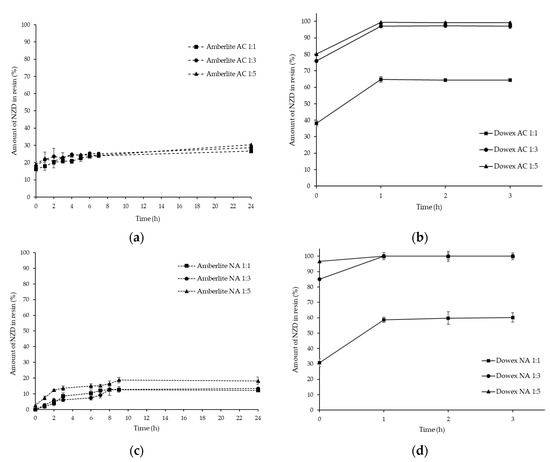 In order to investigate how quickly equilibrium could be reached, 40 µL of supernatant was collected at predetermined intervals during complex formation at room temperature. The supernatant was filtered through a 0.45 µm membrane filter to obtain a clear solution and diluted 300 times with HCl (pH 4.0) for the activated resins or diluted with distilled water for the non-activated one, then measured by UV spectrophotometer (UVmini-1240, Shimadzu, Kyoto, Japan) at 314 nm. The NZD contents in the supernatant were determined from the standard curve of standard NZD in HCl (activated resins) and distilled water (non-activated resins), which demonstrated linearity with high correlations (r2 = 0.9997 and 0.9999, respectively). The amount of NZD in the resin was calculated [amount of NZD in resin (%) = [(total amount of NZD − amount of NZD in supernatant)/total amount of NZD] × 100]. The experiment was done in triplicate.