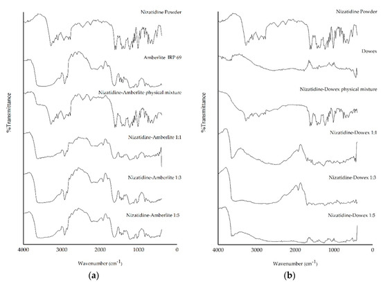 FTIR studies were performed to detect the possible molecular interaction between NZD and the resins. The FTIR spectrum of NZD, Amberlite, Dowex, their physical mixture and NZD-resin complex at ratio of 1:1–1:5 are shown in Figure 3. The characteristic absorption bands of NZD were N–H stretching (~3210 cm−1) for the secondary amine group, NO2 stretching (~1380 cm−1) for the nitro group and C–N stretching (~1435 cm−1) for C–N amine of the drug. Other sharp absorption bands of NZD were C–H stretching (~2940 cm−1), CH2 stretching (~1440 cm−1), CH3 stretching (~2830 cm−1) and C=C stretching (~1520 cm−1) [18,19]. FTIR of the physical mixture of NZD and resins (NZD-Amberlite and NZD-Dowex physical mixtures) showed several sharp absorption bands of NZD and there is no significant change in the position of the characteristic absorption bands. This suggested no formation of the complexation between the resins and NZD in physical mixture. Drug molecules were external to the resin bead. However, when NZD formed a complex with Amberlite at 1:1–1:5 ratios, the spectra of NZD shifted to overlap with Amberlite absorption bands. The spectra of all NZD-Amberlite complex ratios were not significantly different (Figure 3a). For Dowex, the spectra gradually changed in the NZD-Dowex complex. The characteristic absorption bands of NZD at ~3210 cm−1 and ~1435 cm−1 region disappeared especially in NZD-Dowex at a ratio of 1:5 (Figure 3b), indicating the formation of a complex in these systems by interacting amine groups of NZD. This indicates that NZD-Dowex at a ratio of 1:5 could be used to construct a bitter taste-resistant barrier.