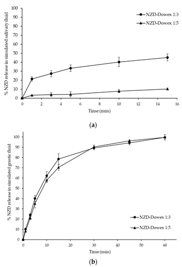 Dissolution profiles of the NZD-Dowex complex at 1:3 and 1:5 ratios (n = 6) in simulated salivary fluid of pH 6.8 (a) and gastric fluid of pH 1.2 (b) at different time intervals.