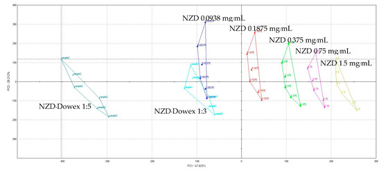 Principal component analysis (PCA) map of the in vitro taste-masking efficiency test of NZD 0.0938–1.50 mg/mL and the NZD-Dowex 1:3 and 1:5 complexes.