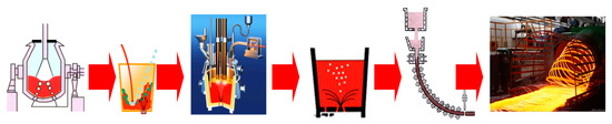 Titanium is a common microalloy addition to steels. It can be used to inhibit grain growth, reduce the incidence of transverse cracking in niobium-containing steels production, stabilize the alloy against sensitization to intergranular corrosion, and improve the service performance [1,2,3,4]. However, a low titanium content is demanded for special kinds of steel production, such as in high-strength tire cord steel, to enhance drawing and twisting performances.