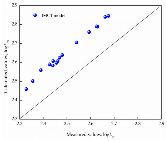 Comparisons between the calculated titanium distribution ratio based on the IMCT and the measured for CaO–SiO2–Al2O3–MgO–FeO–MnO–TiO2 slags balanced with liquid steel at 1853 K in the LF process are expounded in Figure 2. It reveals that the titanium distribution ratio predicted by the developed IMCT model exhibited a dependable agreement with the industrially measured results. Moreover, the predicted values were all higher than the measured , which was due to the fact that the calculated values were acquired in an ideal equilibrium state, while during actual industrial production, the slag-metal reaction was in a local equilibrium or quasi-equilibrium state.
