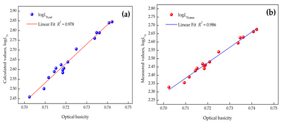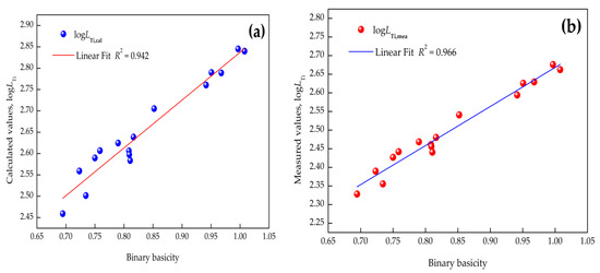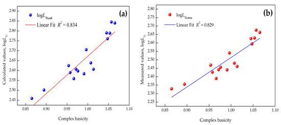The relation between or and binary basicity (), complex basicity , or optical basicity (, where is the mole fraction of a component, and is the optical basicity of a component in slag) obtained by using Pauling electronegativity [33] are depicted in Figure 3, Figure 4 and Figure 5 (where R is the linear correlation coefficient), respectively. It is evident that (1) the relationship between by the IMCT model or and optical basicity had a better dependence than that with the binary or complex basicity of CaO–SiO2–Al2O3–MgO–FeO–MnO–TiO2 slags and (2) raising the basicity can give rise to a distinctly increasing titanium distribution ratio. Linear fit results indicated that the optical basicity could better reflect the structure of the slags, and it is suggested to reflect the correlation between the titanium distribution ratio and basicity of the slags. The reasons for the different linear fits of these models is attributed to the different definitions of basicity. As for optical basicity, all the components in the slag are taken into account, which can reflect the whole features of the slag, while for binary basicity or complex basicity, the de-titanium contributions of other components were ignored.
