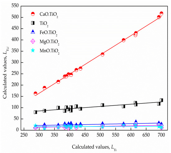 Based on the IMCT, the simple molecule TiO2 in the refining slags can be combined with ordinary molecules—such as CaO, Al2O3, MgO, FeO, MnO, and CaO+SiO2—to form 13 stable de-titanium products as , , , , , , , , , , , , and , respectively. According to the reported expression of the manganese distribution ratio [10,11], the titanium distribution calculation model can be described as