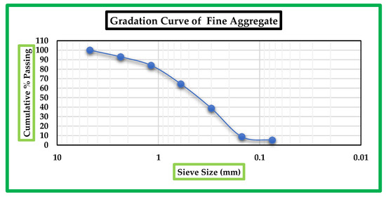 The extreme size of the fine aggregate is 4.75 mm. The physical properties are shown in Table 3 and grain size distribution (sieve) analysis shown in Figure 1.