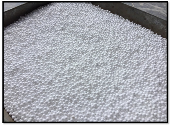 Polystyrene is also known as polyvinyl resin. Structurally, it is an extended organic compound chain, with a phenyl collection connected to each different carbon atom. Styrene is made by a radical vinyl chemical action from the compound polyvinyl resin [37]. Expandable polystyrene (EPS) meantime is styrene in raw beads being steam-heated, inflicting it to expand [38]. EPS-beads are easily available in the market in the form of spherical beads shown in Figure 3. Styrene has been used principally in cold states to form concrete blocks for residential functions [5]. On the other hand, polystyrene beads have demerits that constrain the applying and promotion of EPS-beads concrete: they are very lightweight which may cause separation in commixture [39]. On the other hand, the merit is that they are hydrophobic [40] because on behalf of this merit it can be easily used in concrete production. Due to its water absorption criteria, it can be easily used without adding extra water to the concrete. EPS-beads are produced in three key steps of pre-expansion, aging and molding [23]. Some physical characteristics of expanded polystyrene beads are shown in Table 5 according to ASTM C-578 [41]. Expanded polystyrene beads (EPS) are spherical in shape and according to ASTM C-578 classification, Type XI beads with a density of 12 kg/m3 have been used in this study.