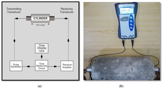 A non-destructive test was executed on concrete to analyze its behavior and to determine its mechanical characteristics. It is straightforward to use, and outcomes were hastily attained on-site [44,45,46,47,48,49,50]. The basic principle of UPV is that the pulse wave is produced due to the electro-acoustical transducer. This pulse wave moves through the concrete and the time that the pulse wave takes to travel the sample is to be measured. With the help of this time, the longitudinal or pulse velocity is measured. Two transducers are used, one is a transmitter and the other is receiver [51]. The formal diagram of UPV [52] according to ASTM C-597 is shown in Figure 4. Ultrasonic Pulse velocity test equipment of brand MATEST (Italy) with a measuring range (0–3000 µs—accuracy +/−0.1 µs) and two 55 kHz probes with connection cables, based on ASTM C597 standard, were used in this study as shown in Figure 4.