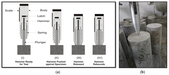 Many non-destructive test techniques have been developed and used to conclude the compressive strength of concrete. However, in all of these techniques, the rebound hammer test is usually used to conclude the compressive strength of concrete [31]. Basically, this is a surface rigidity test and it also works on the principle of elastic mass that impinges into a hardened surface [54]. In 1948, Schmidt established the Schmidt rebound hammer check. This device is collectively used attributable to a hardened steel hammer compact on the concrete by a spring. [56]. This test is conducted on concrete specimens with rebound hammer–aluminum framed for brand MATEST (Italy) having a spring impact energy of 0.225 m·kg (2.207 Joule or Nm). Ten rebound readings were to be taken on a test area of each cylinder and the average of these readings was taken. In this study, the rebound hammer was applied to the cylinder in a vertically downward direction. The test was applied according to ASTM-C805. The operational diagram is shown [57] in Figure 5.