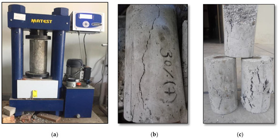 After the successful complaint of non-destructive testing, the compressive strength test was conducted on every specimen at 7 and 28 days shown in Figure 6 according to ASTM C-39 [58]. A compressive strength test was applied with the compression test machine of brand MATEST (Italy) and was conducted respectively in accordance with the ASTM Standard ASTM C39. Compressive strengths were calculated for cylindrical specimens of 110 mm (4.334 in.) diameter and 220 mm (8.668 in.) height. Automatic compression machines with 2000 kN capacity were used for compression test having a rate loading rate of 5 kN/s (1.124 kips/s) fixed for these specimens.