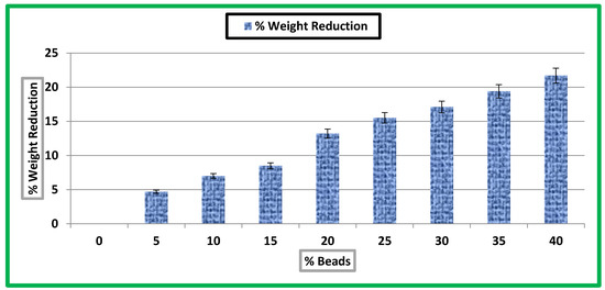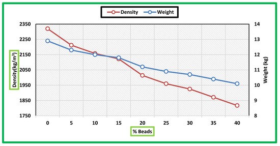 In this study, the maximum and the minimum density is 2330 kg/m3 and 1800 kg/m3 at 0% and 40% replacement of aggregates with beads. This figure also represents the direct relationship between % beads and density also weight. The maximum weight of the cylinder at 0% replacement is 12.9 kg and the minimum is 10.1 kg at 40% beads replacement. Also, the EPS-beads lightweight concrete density varies from 1800–2200 kg/m3. Percentage weight reduction is shown in Figure 8.