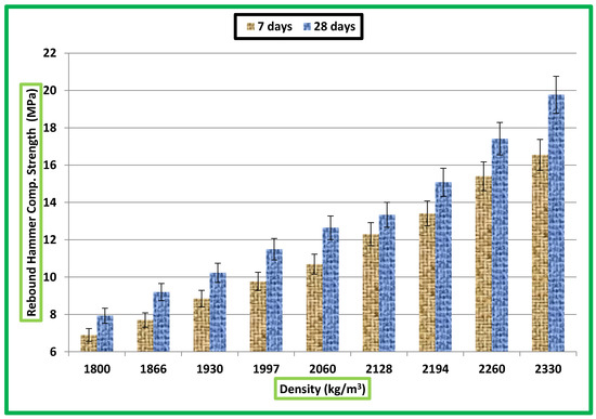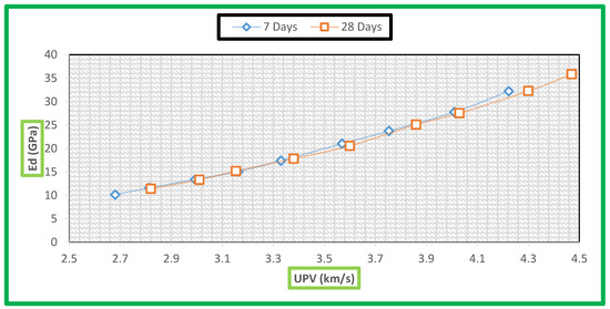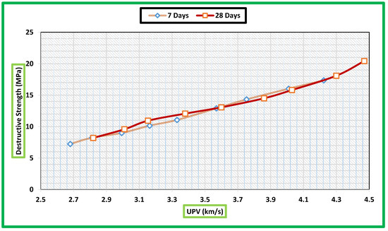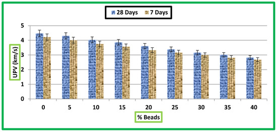 According to Jones et al. [55], if the concrete has a large air-filled void, then its transit time will be longer and due to the longer transit time, the velocity values are high. Due to this, in the present research, the velocity values are high because due to the increasing volume of EPS-beads the entrapped air voids increased, which also decreased the strength and velocity values. An investigation into the engineering properties of concrete reported that as a consequence of the cement–water hydration as a consequence of the cement–water hydration process over curing time, the physical and chemical changes will occur in the concrete and will increase the strength and density and, as a result, will increase the UPV values of concrete [2,60].