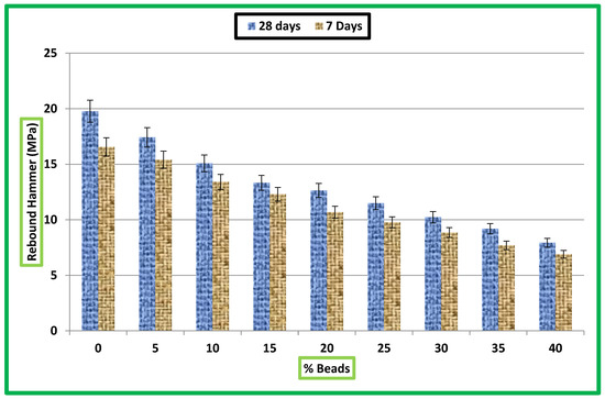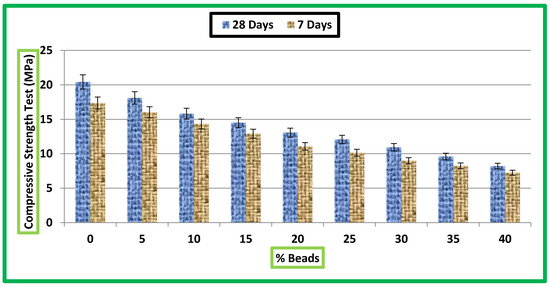 As the EPS-beads’ content increases directly, the concrete density decreases. That occurs because the density of EPS-beads is much less than that of natural rocky coarse aggregate [2]. The density variations also occur due to the variations in the entrapped air content against the different EPS-beads’ dosage contents. Density is also changed as the w/c ratio varies [59]. As the thermal insulation properties of EPS-beads’ concrete increases, at the same time, a lot of dead load saving is achieved and also the density decreases [6]. In our research, approximately 22% of dead load saving is achieved at 40% beads content. As the EPS-beads’ content increases, the amount of entrapped air voids entering the concrete increases and the density decreases [60,61].