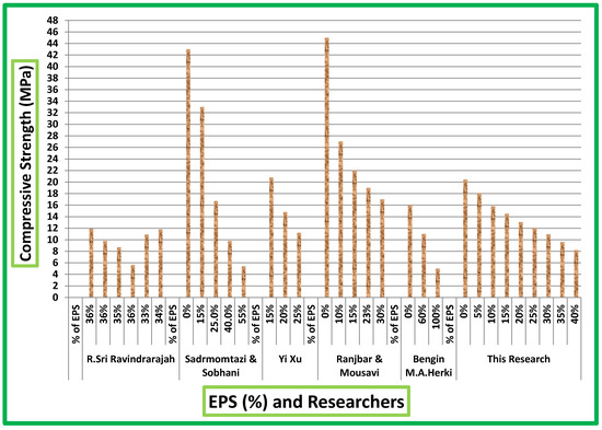 As percentage replacement is increased, the dead load reduction is increased. However, the compressive strength of concrete is decreased. The link between density and compressive strength is directly related. In fact, at lower density, the compressive strength is only 8.21 MPa at 28 days. In this study, the density ranges from 1800–2330 kg/m3 and the compressive strength ranges from 8–21 MPa. To compare the performance of the developed EPS concrete with already conducted research based on compressive strength, the comparison is shown in Figure 15. A similar trend can be seen in the graph shown. Figure 15 indicates the comparative analysis of compressive strength of this study with previous research studies that also show a similar trend of strength; as the dosage of EPS-beads is increased, the strength of concrete is decreased. The lower strength of EPS-beads lightweight concrete with respect to reference concrete (0% EPS-beads) may be due to the following factors: