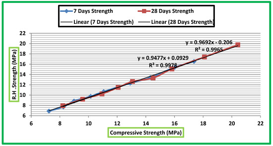 The strength obtained theoretically varies from 7–18 MPa at 7 days. On the other hand, the range varies from 8–19.5 MPa at 28 days. All of these values lie in the range of tentative strength values.