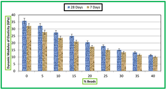 Dynamic modulus of elasticity basically originates out via pulse waves; the formula is given above. It can also be found by putting the values of density and pulse velocity and poisons ratio [3,30]. Figure 23 shows the relation between percentage beads replacement and Ed at 7 and 28 days.