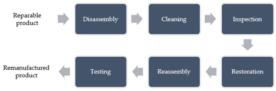 Effective recovery strategies for end-of-life products are made possible due to the development of sustainable products based on life-cycle thinking [11]. Today, remanufacturing is highlighted as the most value-added strategy for end-of-life products and has been widely implemented in many countries [12]. It is capable of reverting a used product to its initial performance at a surety of equal or better than a newly-manufactured product [13]. Furthermore, the useful life of the product is expected to be extended through sustainable design strategies of the product life cycle [14]. Remanufacturing, as compared to recycling, is a more resource efficient recovery strategy as it retains durable cores in their subsequent life cycles, hence reducing the need to manufacture new components every time [15]. Nevertheless, the main activities of remanufacturing are: disassembly, inspection, cleaning, reassembly, restoration, and testing by skilled workers [16]. The processes involved in the remanufacturing of reparable products are shown in Figure 1.