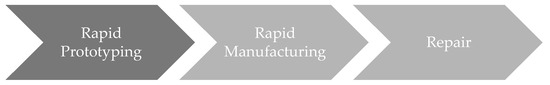AM is popularly referred to as 3D printing [34]. Rapid prototyping was the first implementation of such technology in the 1980s, namely as a method for making prototypes of a product [35]. The subsequent implementation of AM was aimed to create an end product, which is commonly known as rapid manufacturing [36]. This technology is highly capable of shortening the manufacturing process [37] and producing complex products without difficulties [38,39,40]. Today, technology advancement alongside AM is deemed as the solution for conducting the repair and restoration in products. For remanufacturing, AM is expected to be the technology that enables the substitution of manual reparation for remanufacturable cores [41]. The progress in AM application today is depicted in Figure 2.